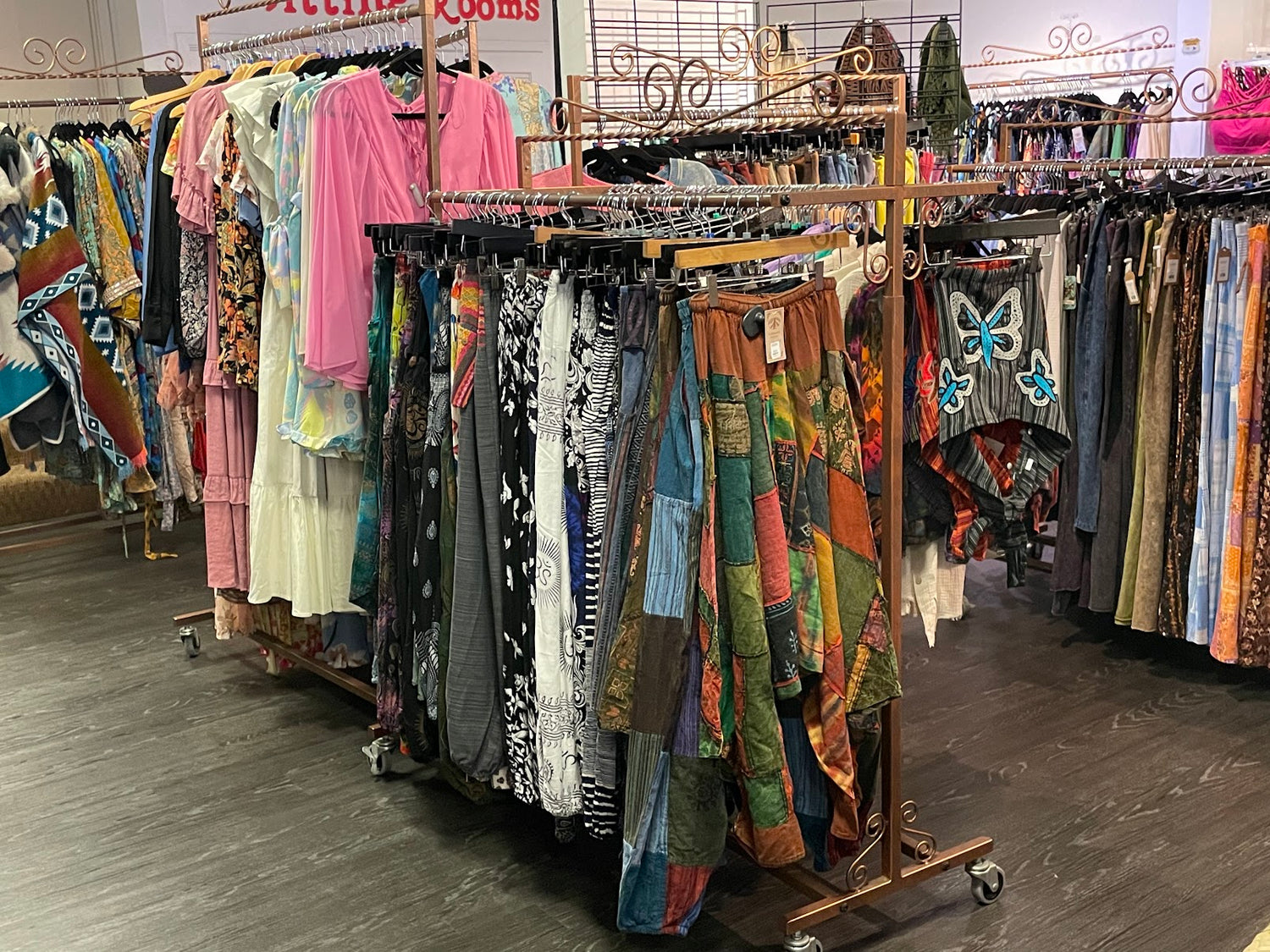 We have a wide selection of clothing including but not limited to, jackets, dresses, pants, and simple tops. We do have swimwear and a small selction of men's as well!
