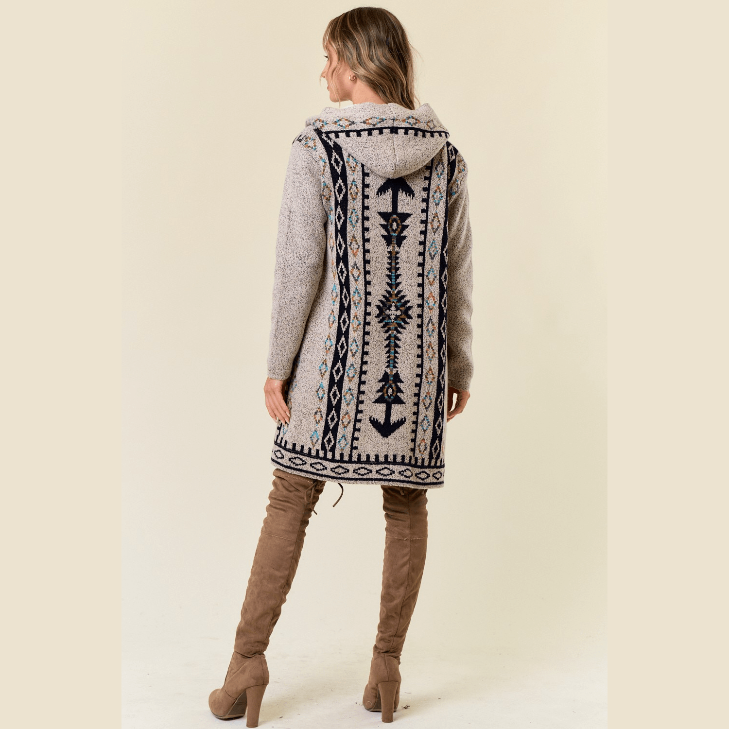 Sweater Hooded Long Sleeve Two Front Pocket Button Down Long Cardigan Rainbow Aztec Patterned with Sherpa Lining