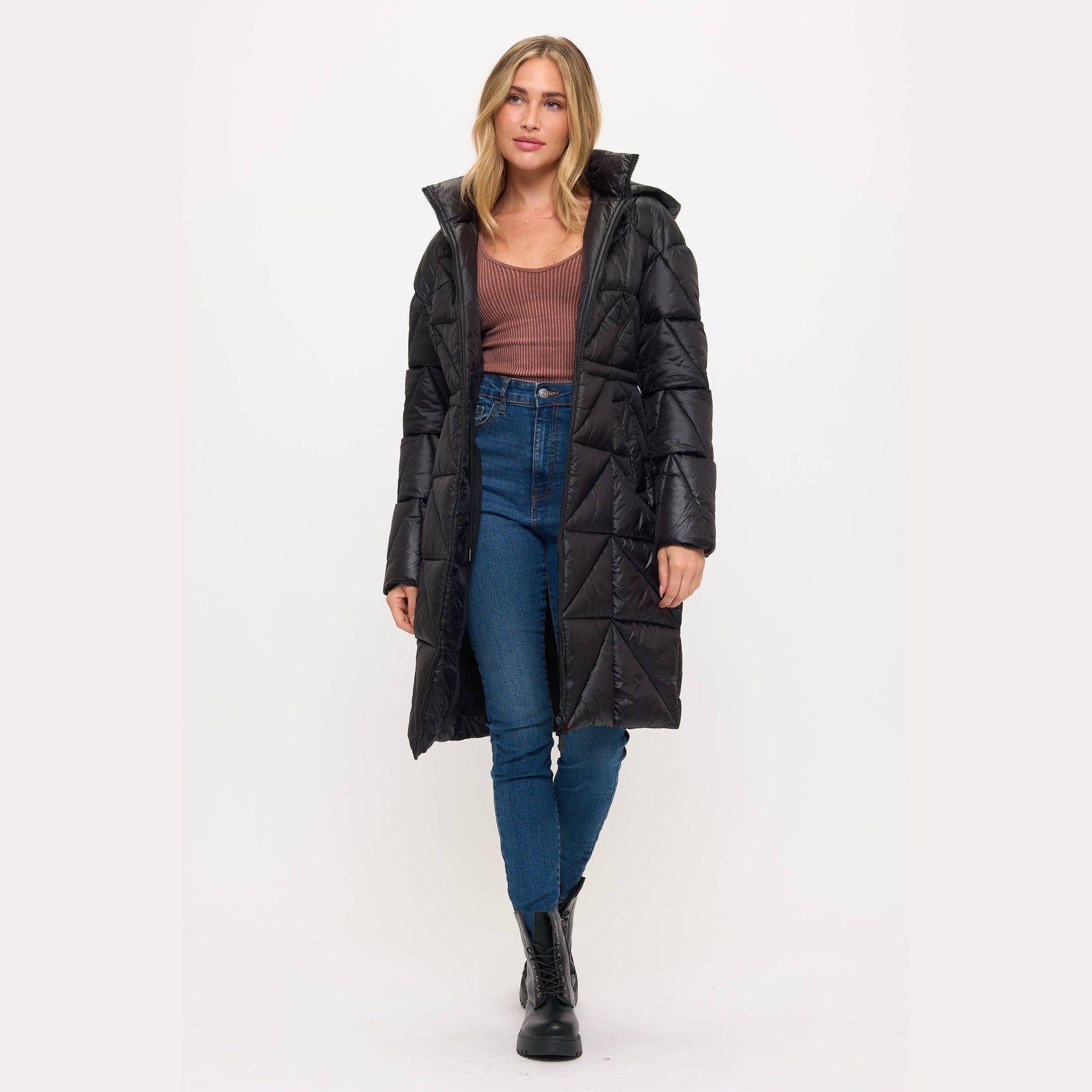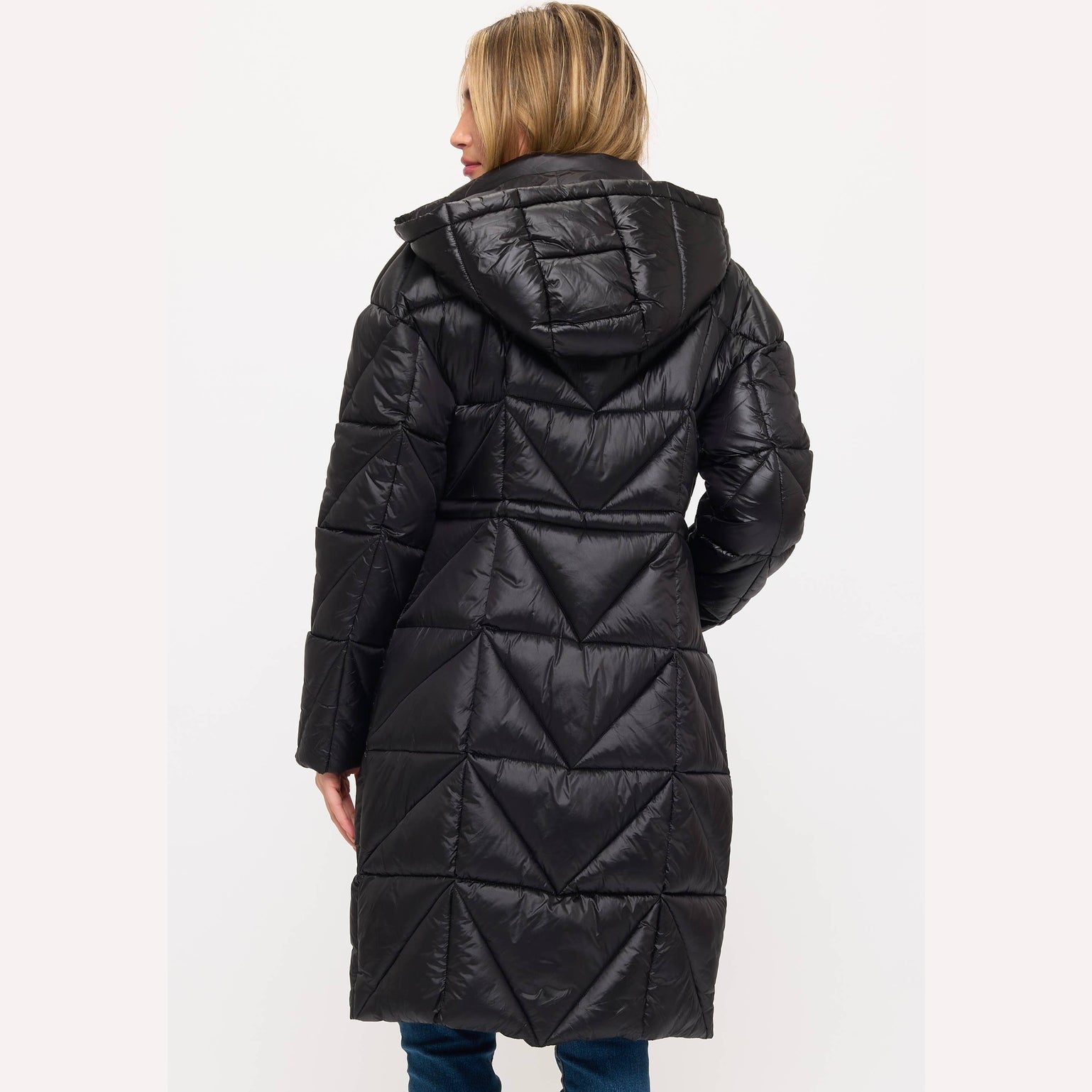 This striking longline coat combines angular diamond quilting with sleek belt accent for modern architectural appeal. The tailored silhouette features innovative geometric patterning that enhances feminine curves while providing exceptional insulation through premium puffer technology.