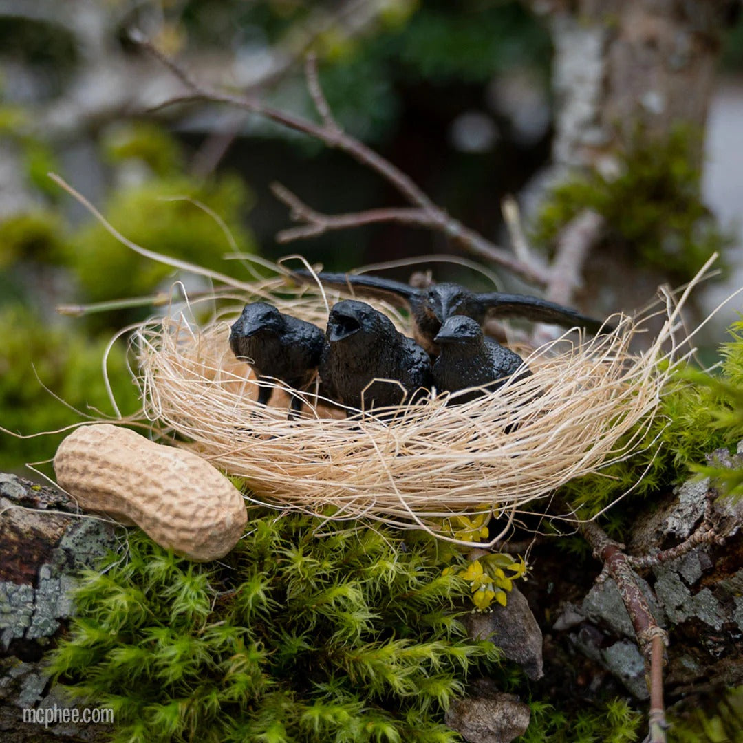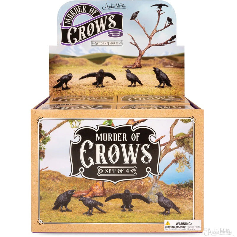 Sure, a group of crows is called a murder, but that doesn’t mean that they have homicidal intent. This set of four differently posed crows just want to decorate your space or sit comfortably in the matchbox style package they come in. Each of these corvid cuties is made of hard vinyl and is between 1" (2.5 cm) to 1-1/4" (3.1 cm) tall. They even come with their own nest! Illustrated box.