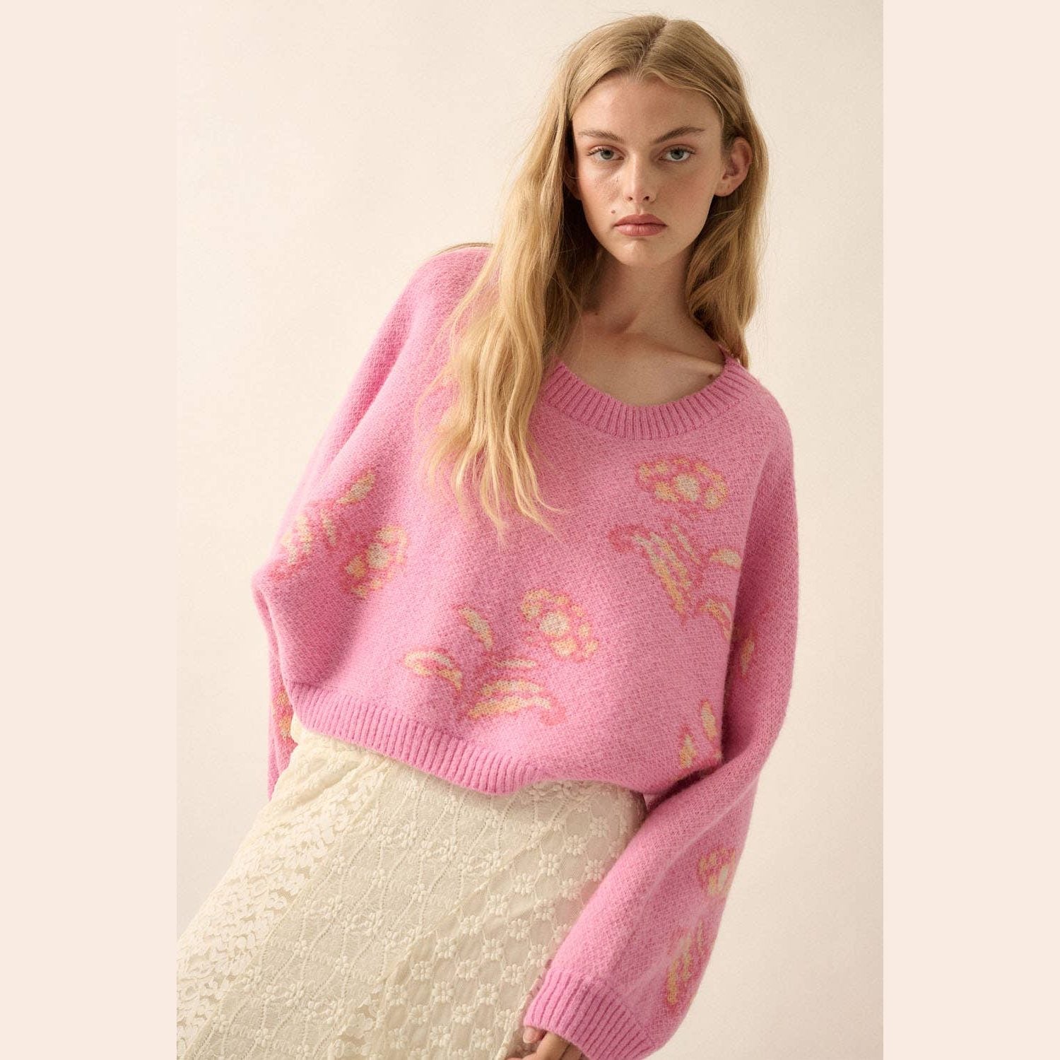 A floral-pattern knit sweater with the following features: