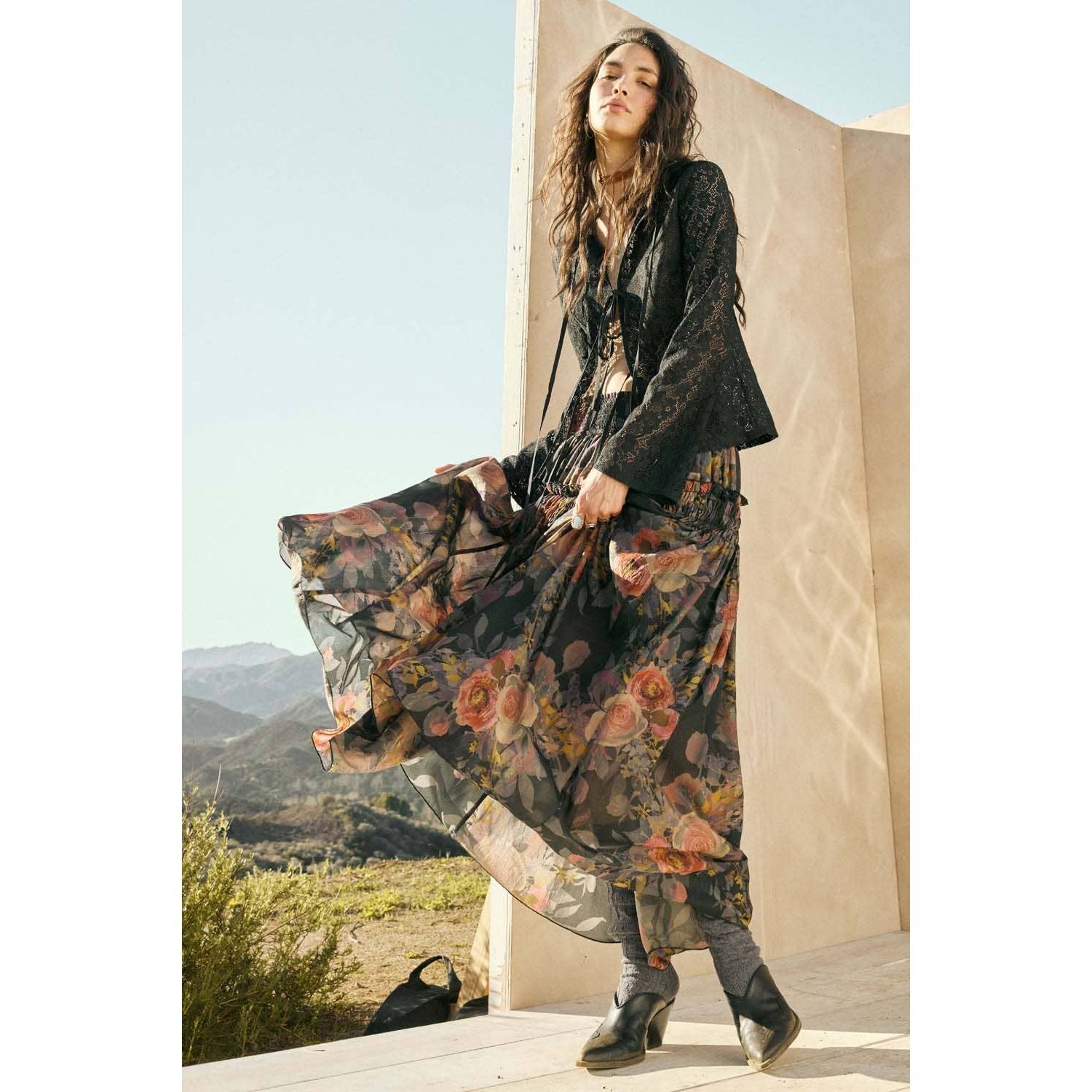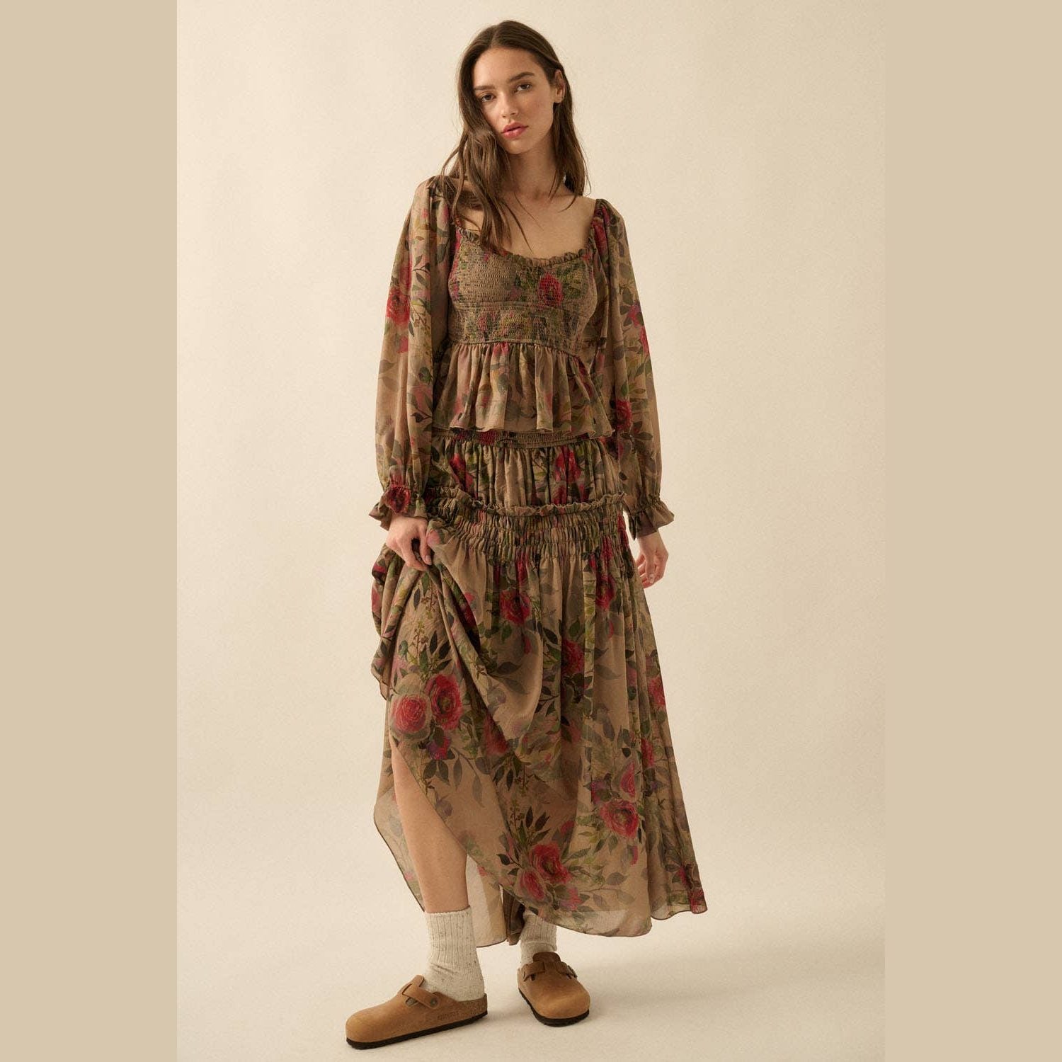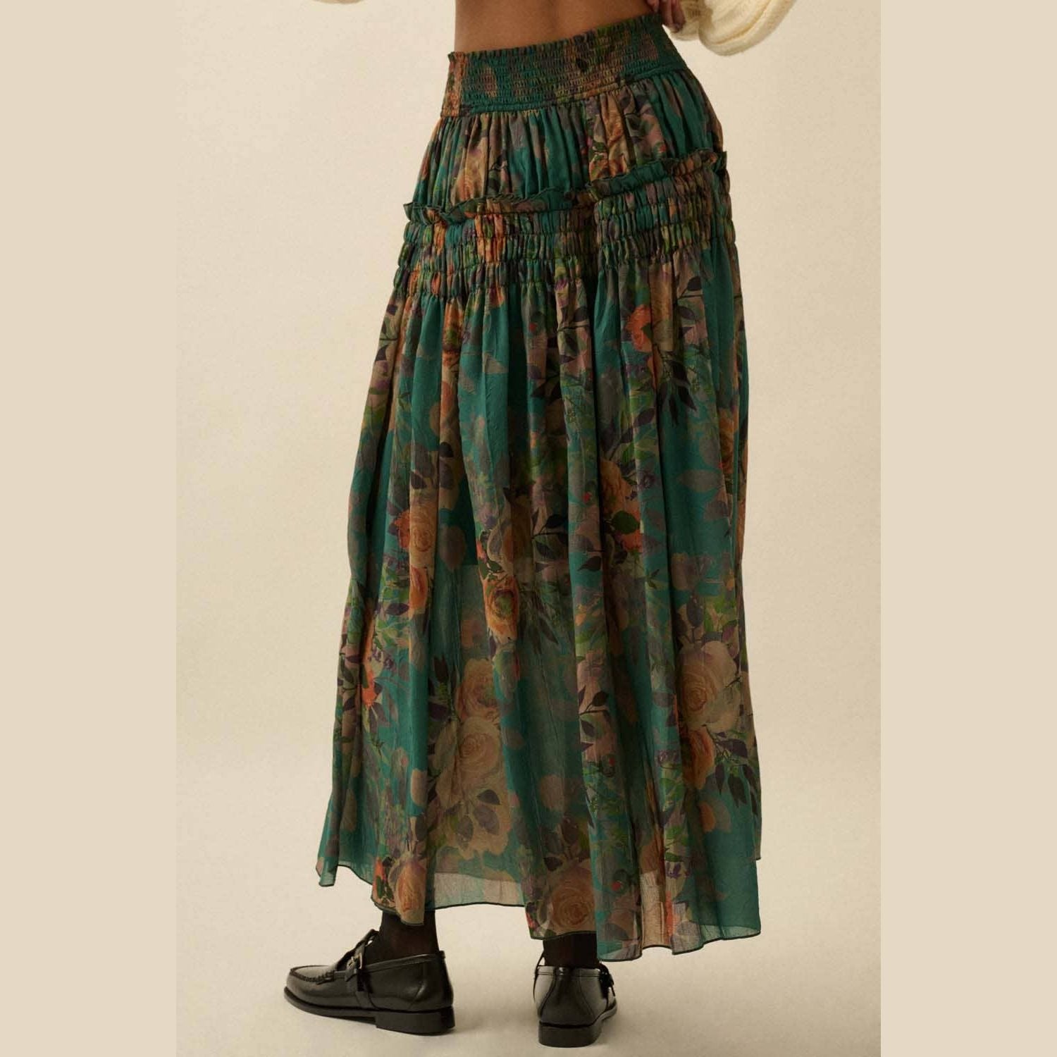 Floral-Print Smocked Drop-Waist Ruffle Maxi Skirt