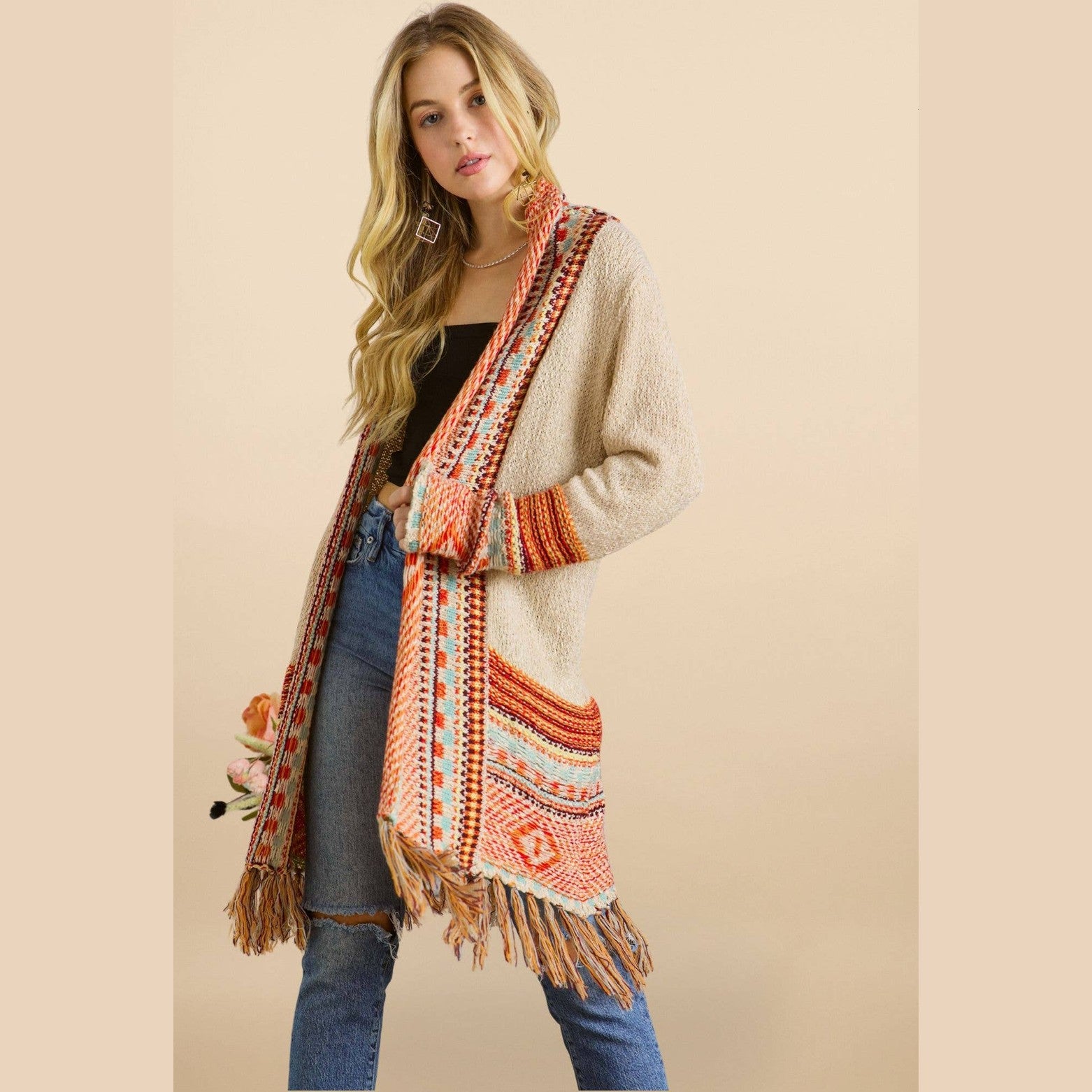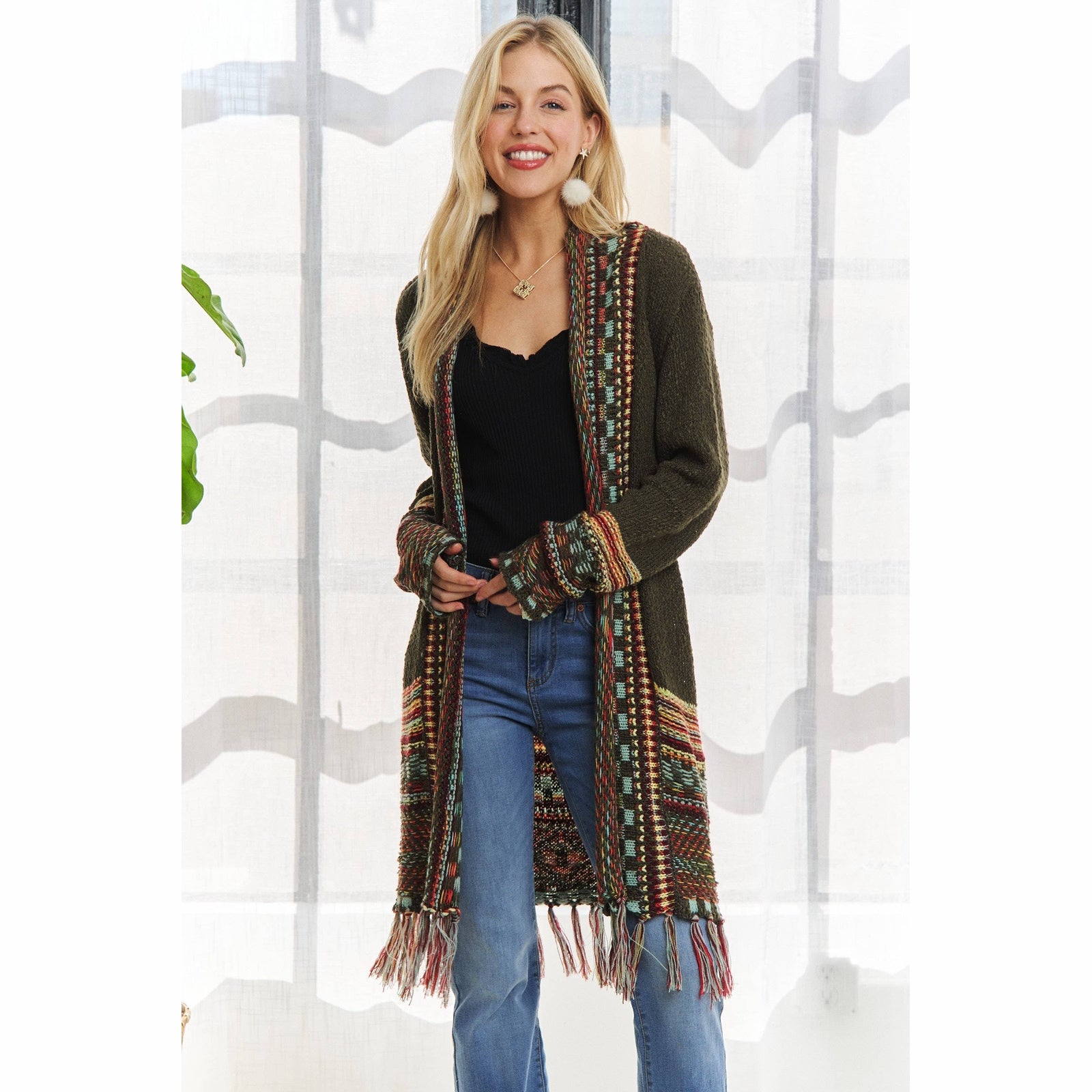This longline cardigan features a textured knit construction, offering a comfortable and cozy feel. The design is enhanced by a vibrant, all-over tribal-inspired pattern that adorns the edges, cuffs, and hem. Adding a bohemian flair, the hemline is finished with playful, cascading fringes. The material blend of 65% acrylic and 35% polyester ensures durability and ease of care, making it a versatile layering piece for various casual outfits.