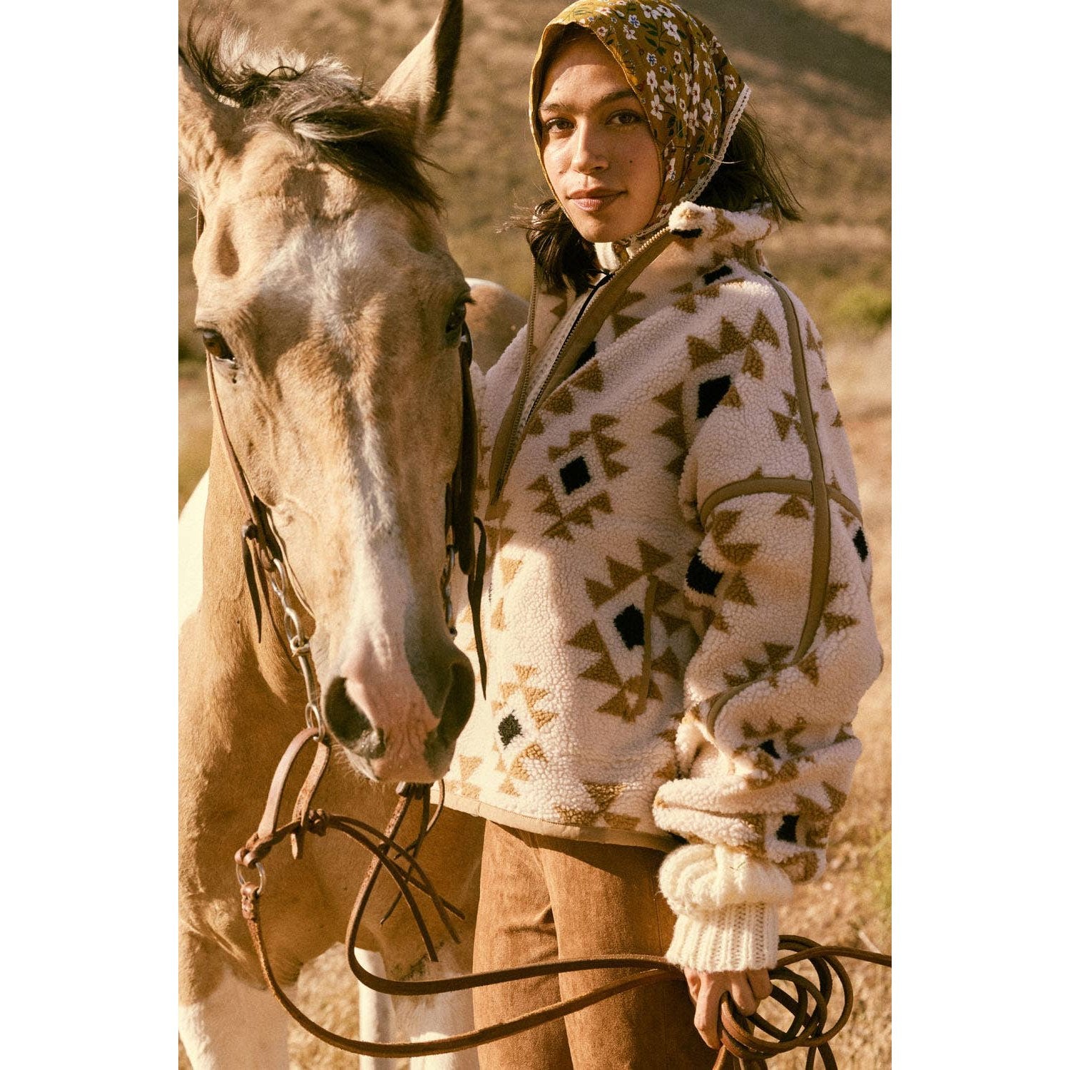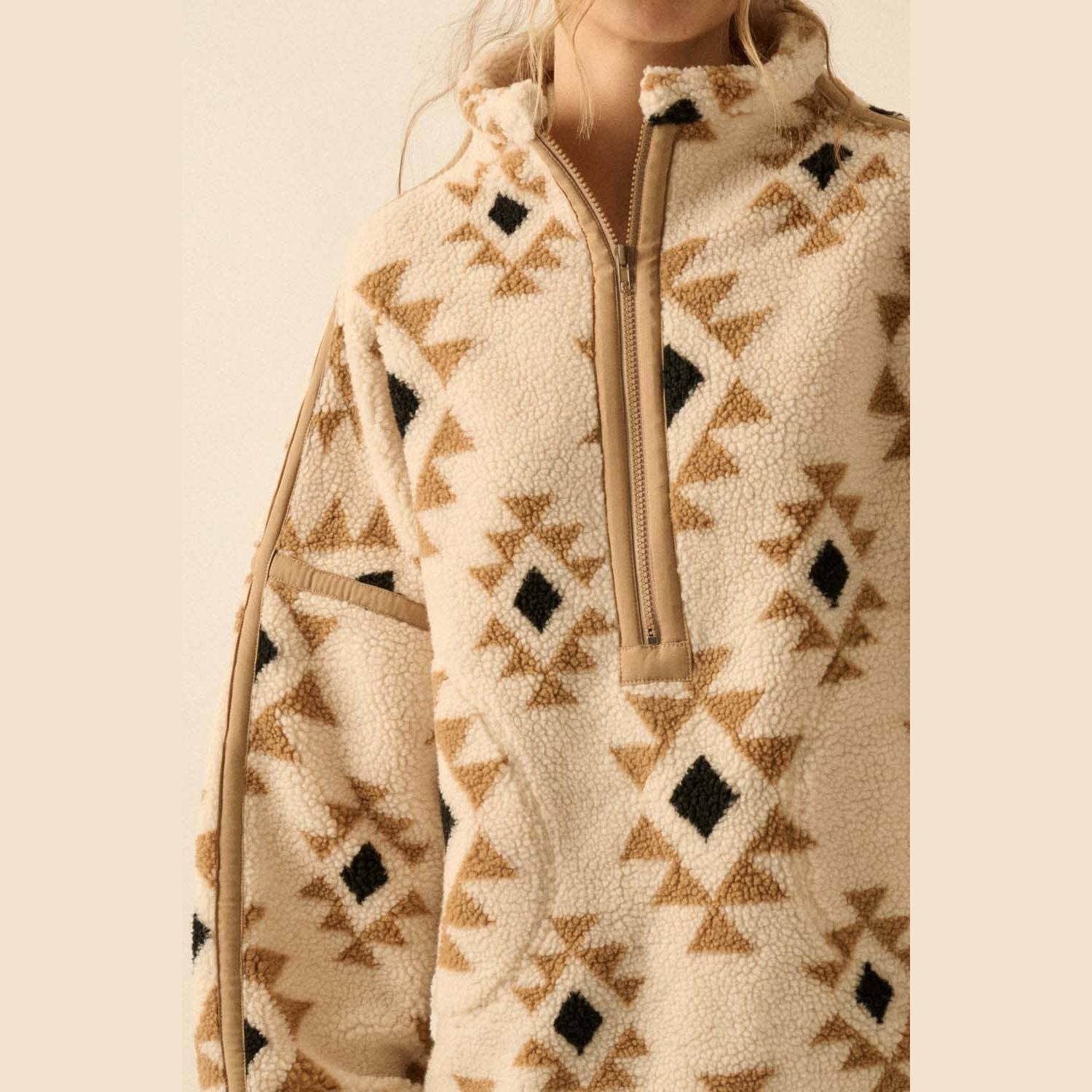 A geometric-print sherpa fleece pullover jacket with the following features: