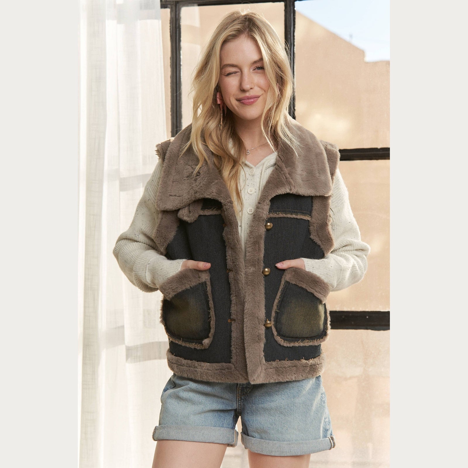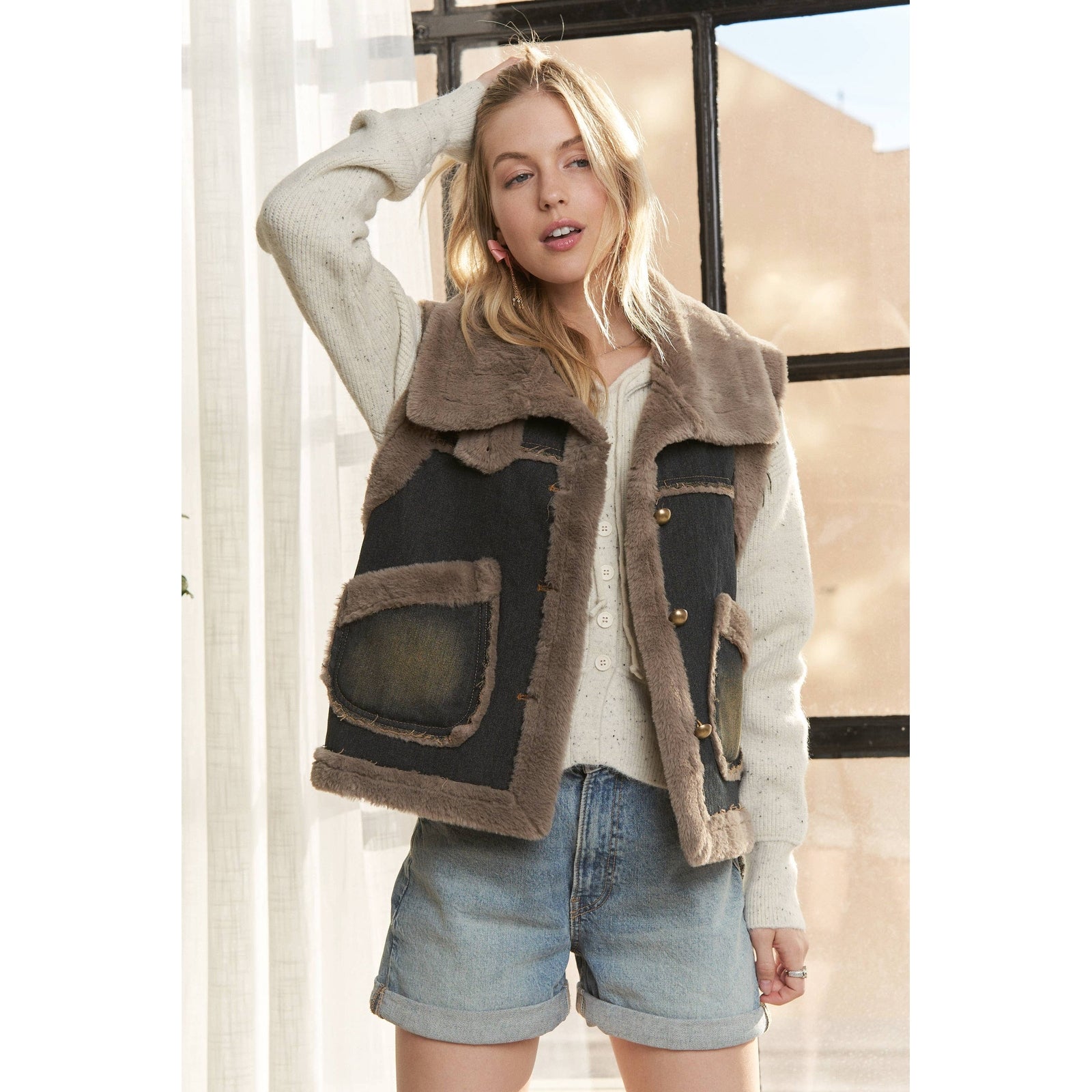 This jacket is crafted entirely from 100% polyester, offering a soft and comfortable feel. It features a distinctive denim-inspired exterior, lending a rugged yet stylish aesthetic. The interior is lined with plush faux fur, providing warmth and a luxurious touch. The design includes a classic neckline, evident in the button-up front of the garment underneath, and the jacket itself is sleeveless, perfect for layering. The faux fur trim accents the edges and collar, adding a cozy and fashionable detail.