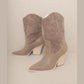 Leaning into the wide mouth loose fit boot look, this western inspired boot is perfectly on trend to wear with a pair of tucked in jeans or any shorts. Shaft Height: 8.75" Heel Height: 3.5" Types of Closures: Slip on Circumference of Shoe Opening: 12.5" Shaft Circumference: 11"