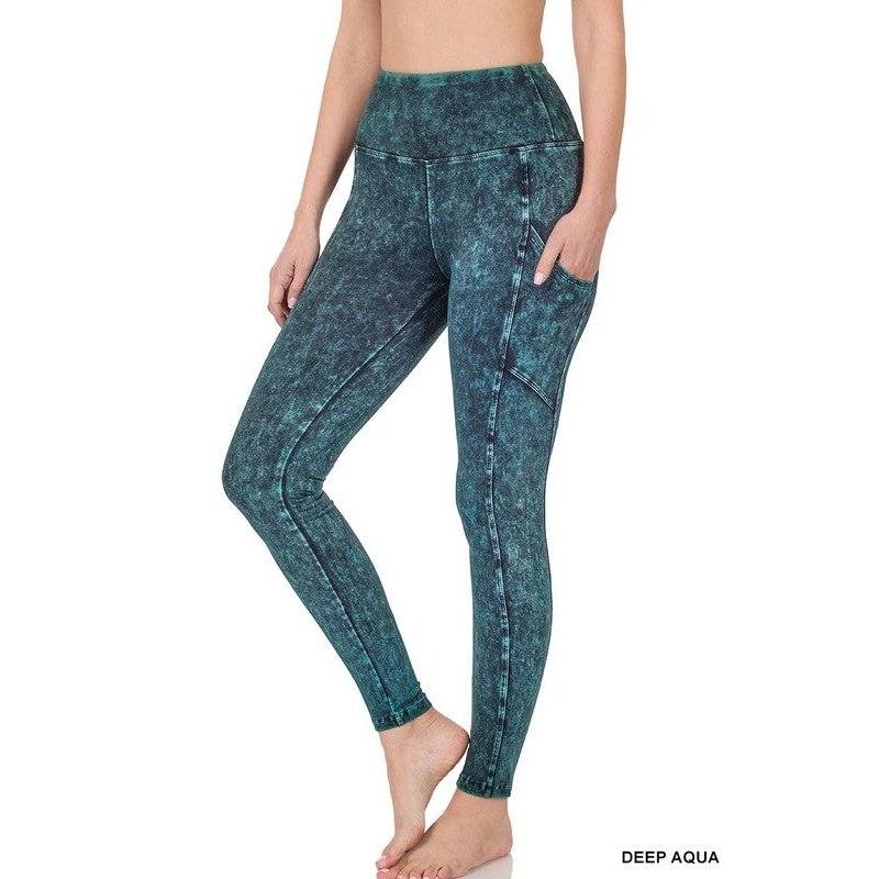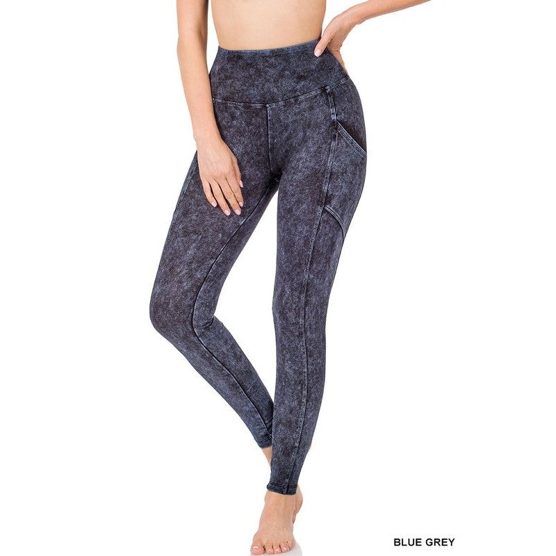 MINERAL WASH WIDE WAISTBAND FULL LENGTH LEGGINGS WITH POCKETS * Each item is unique, expect variations in color and finishing TOTAL WAIST: 26", INSEAM: 26" approx. - MEASURED FROM SMALL * COLOR MAY VARY SLIGHTLY DUE TO MONITOR RESOLUTION