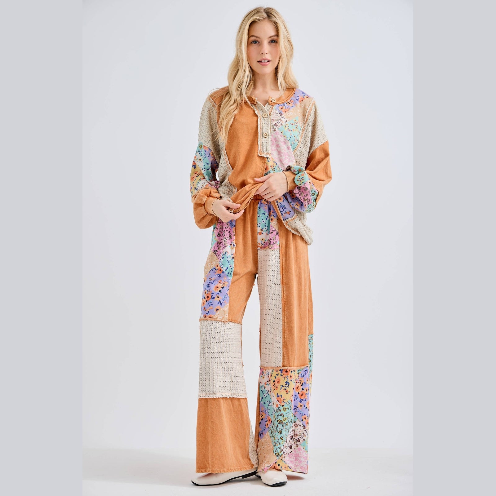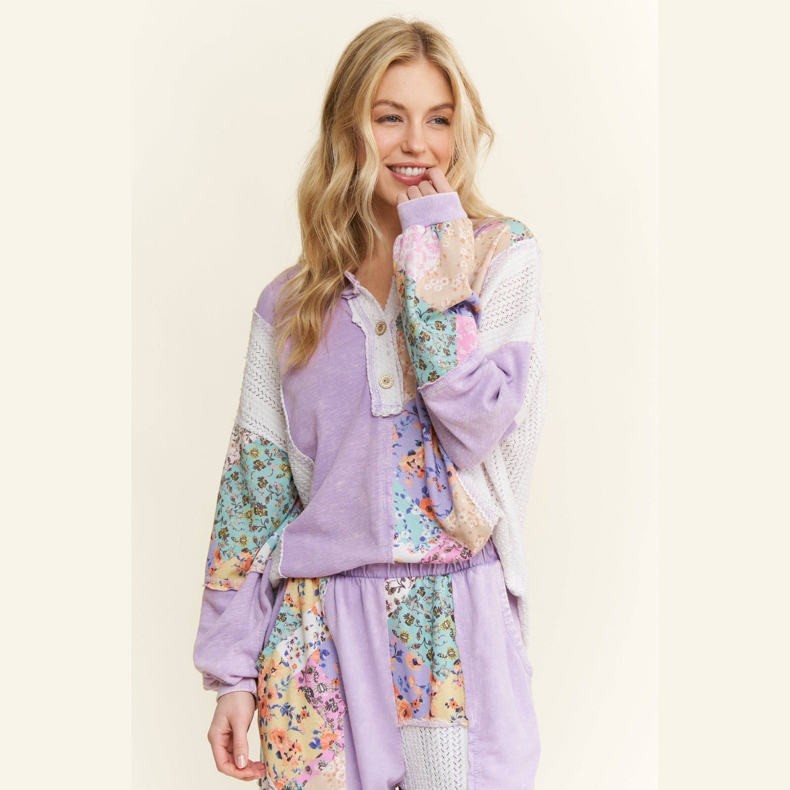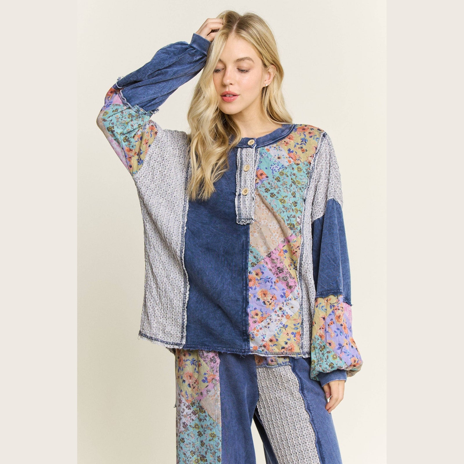 Mineral Washed Floral WaveKnit Jacquard Henley Boho top
