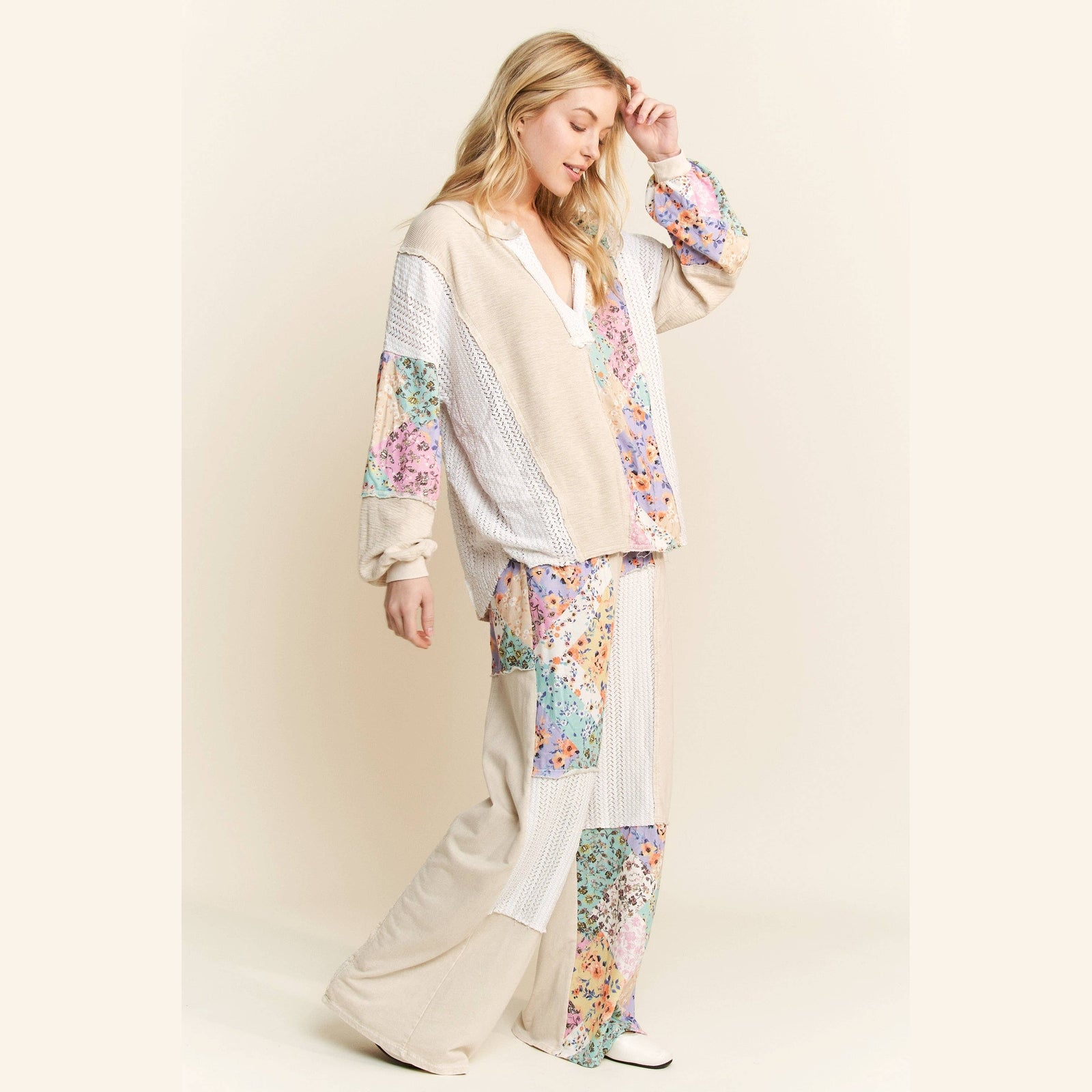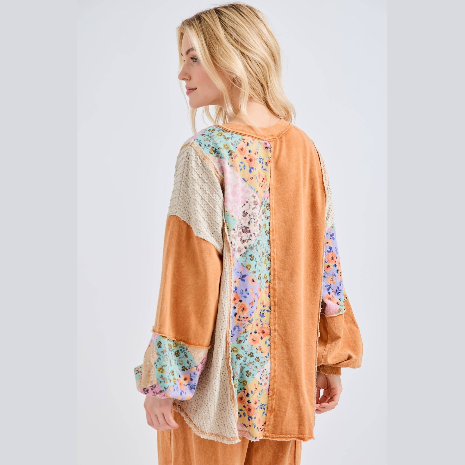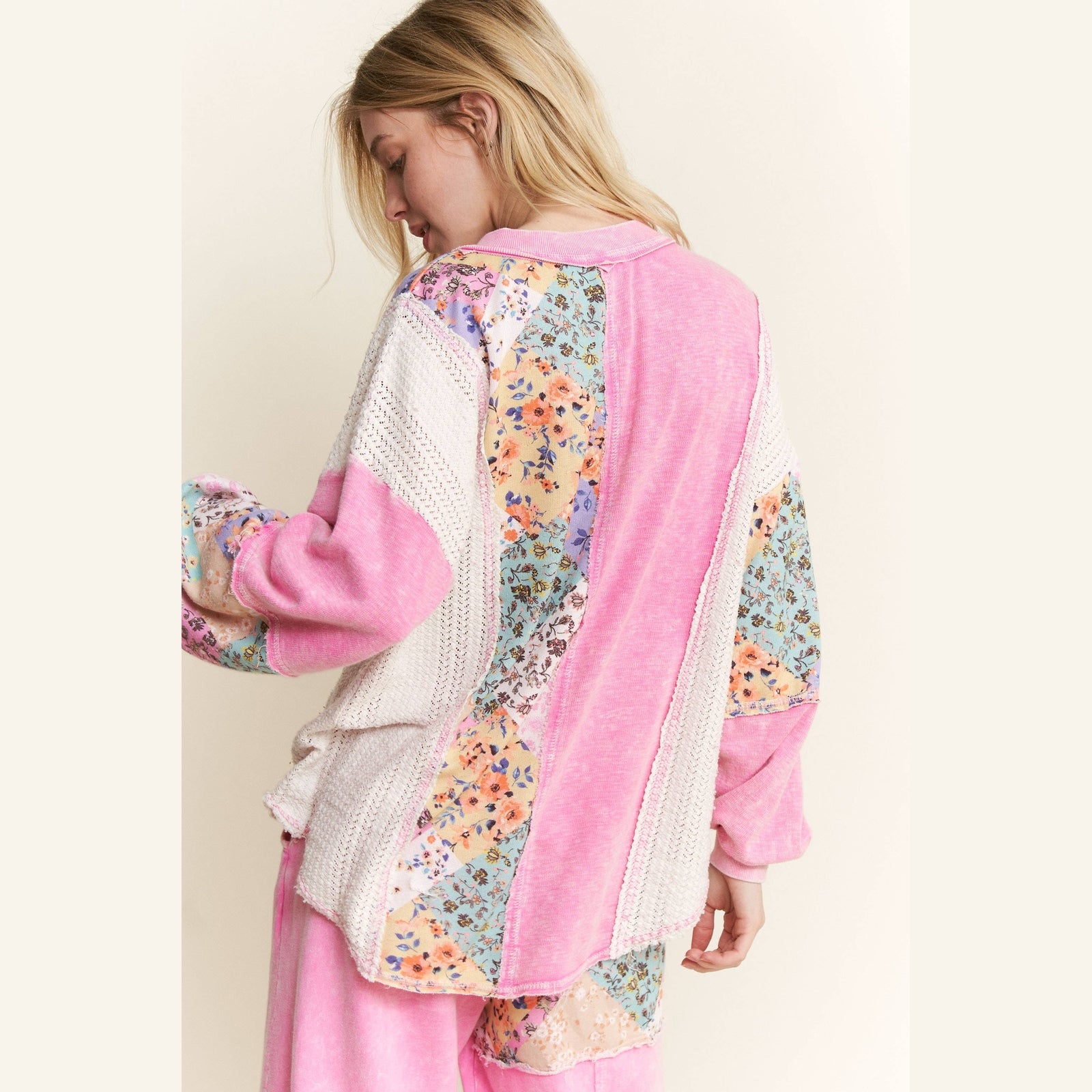 Mineral Washed Floral WaveKnit Jacquard Henley Boho top