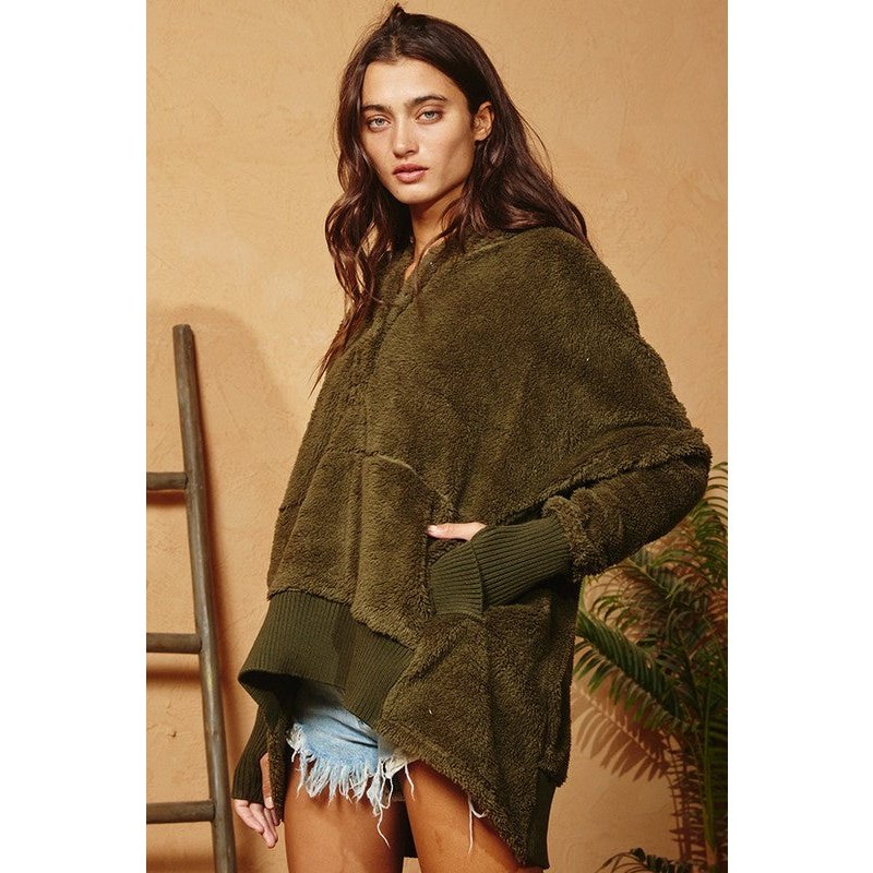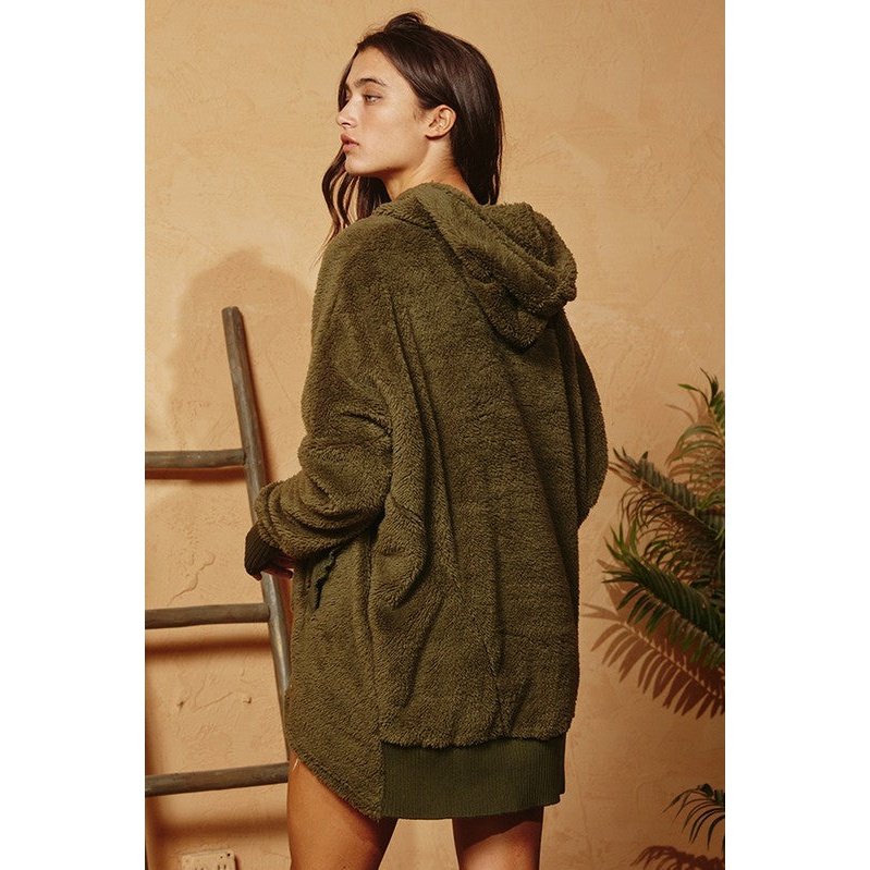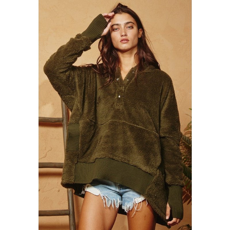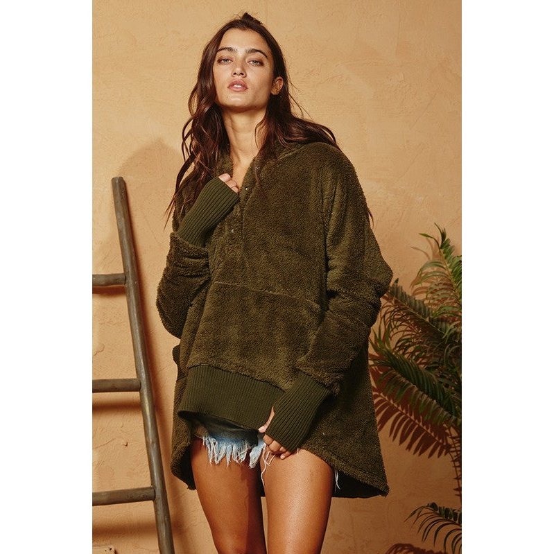 Oversized Fake Fur Hoodie Top - Button up front - Tunic length - Ribbed cuffs, pockets and hemline - Side pockets - So comfy and cozy top