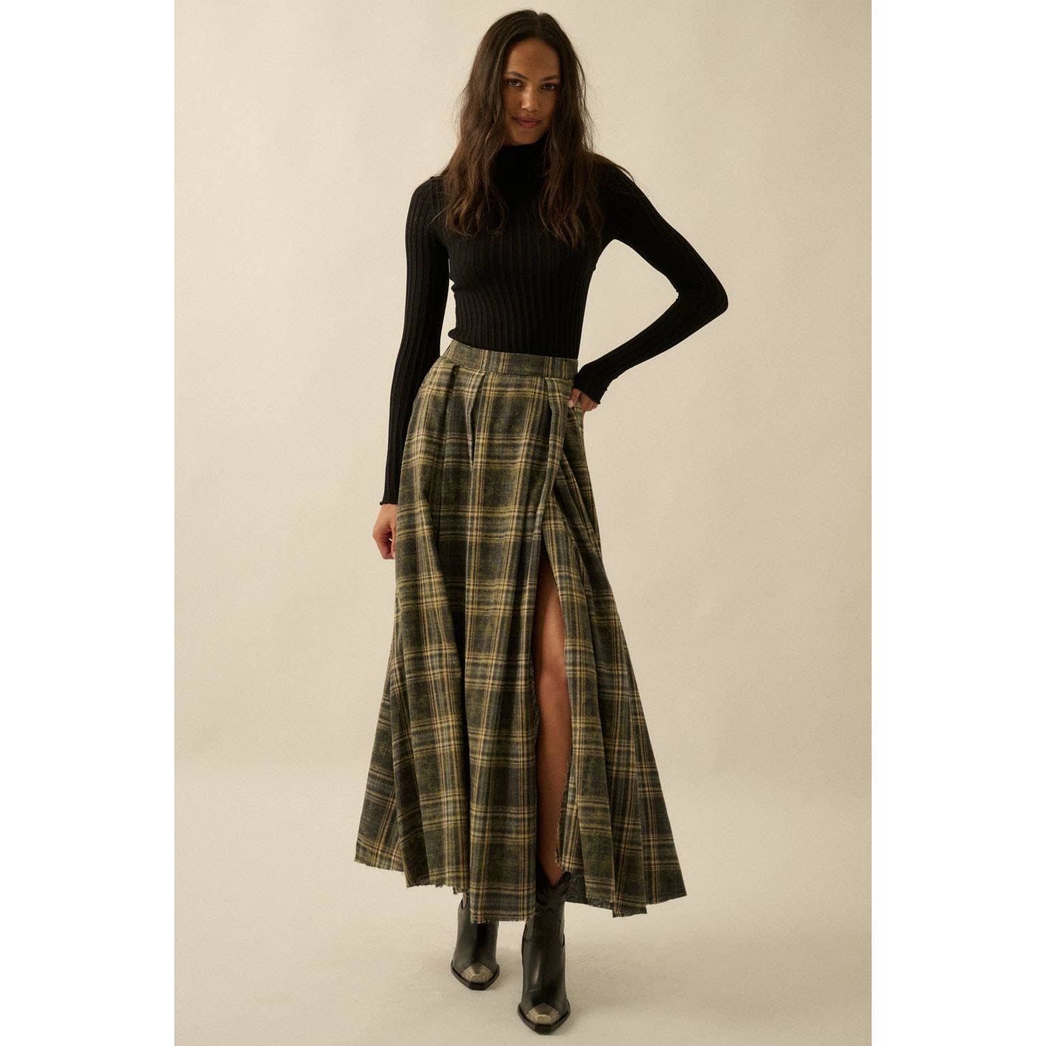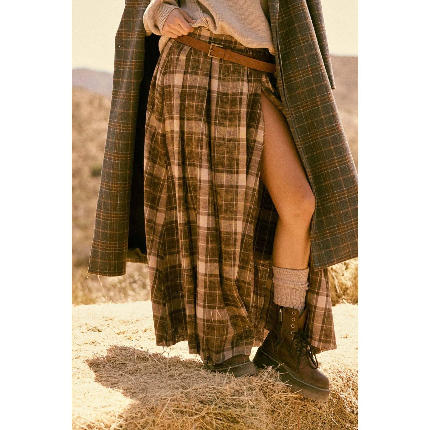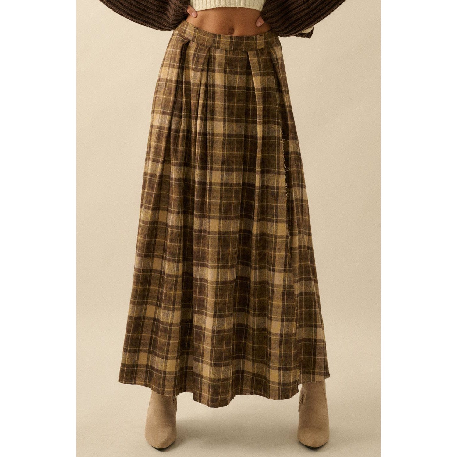 Plaid Flannel Pleated Wrapped Raw-Edge Maxi Skirt