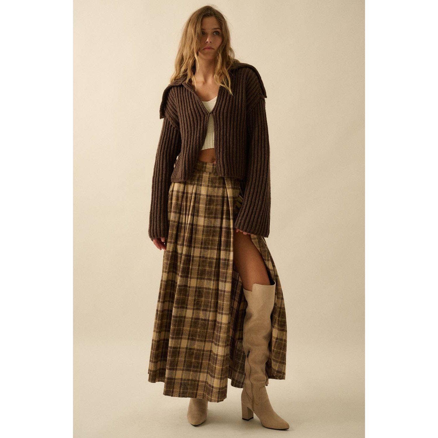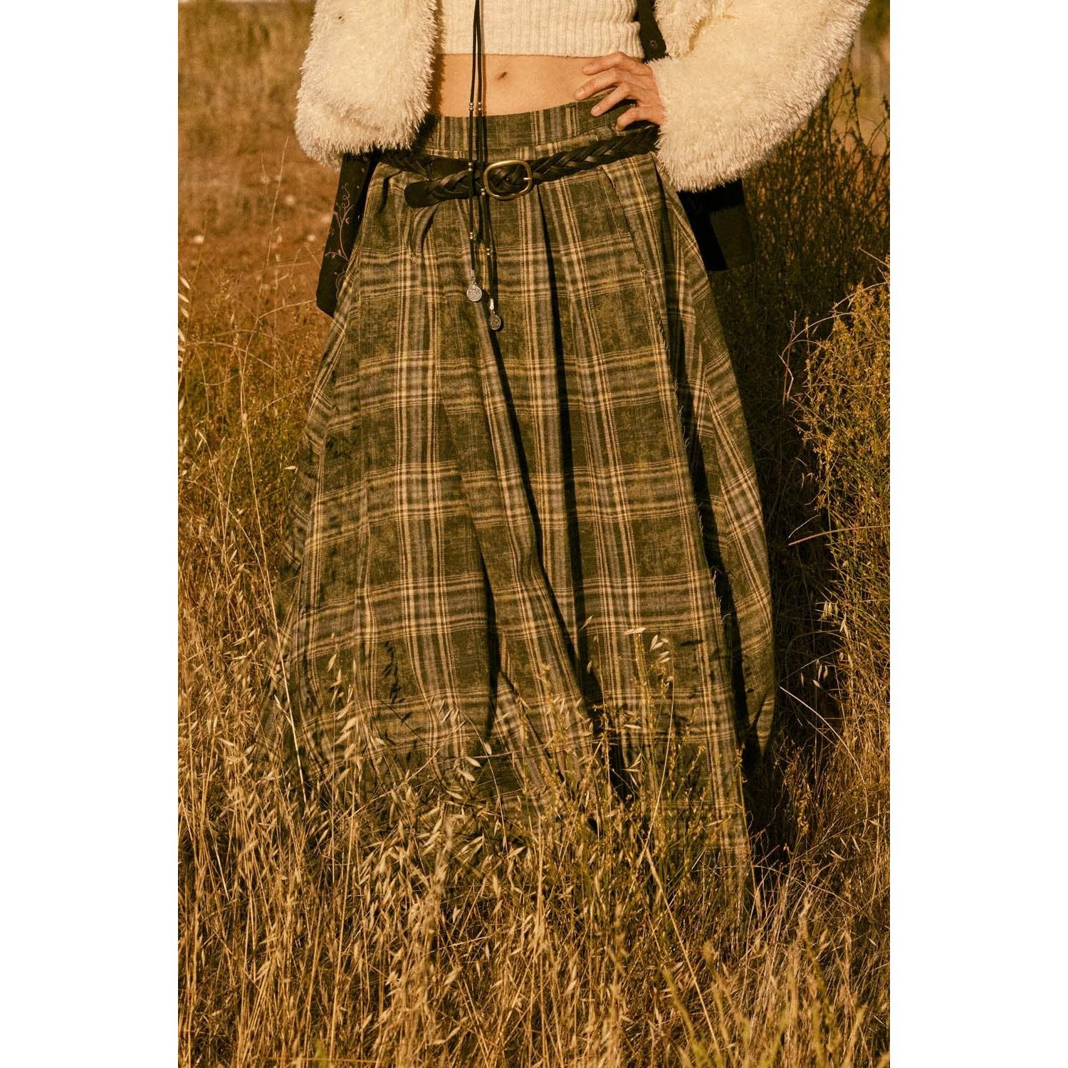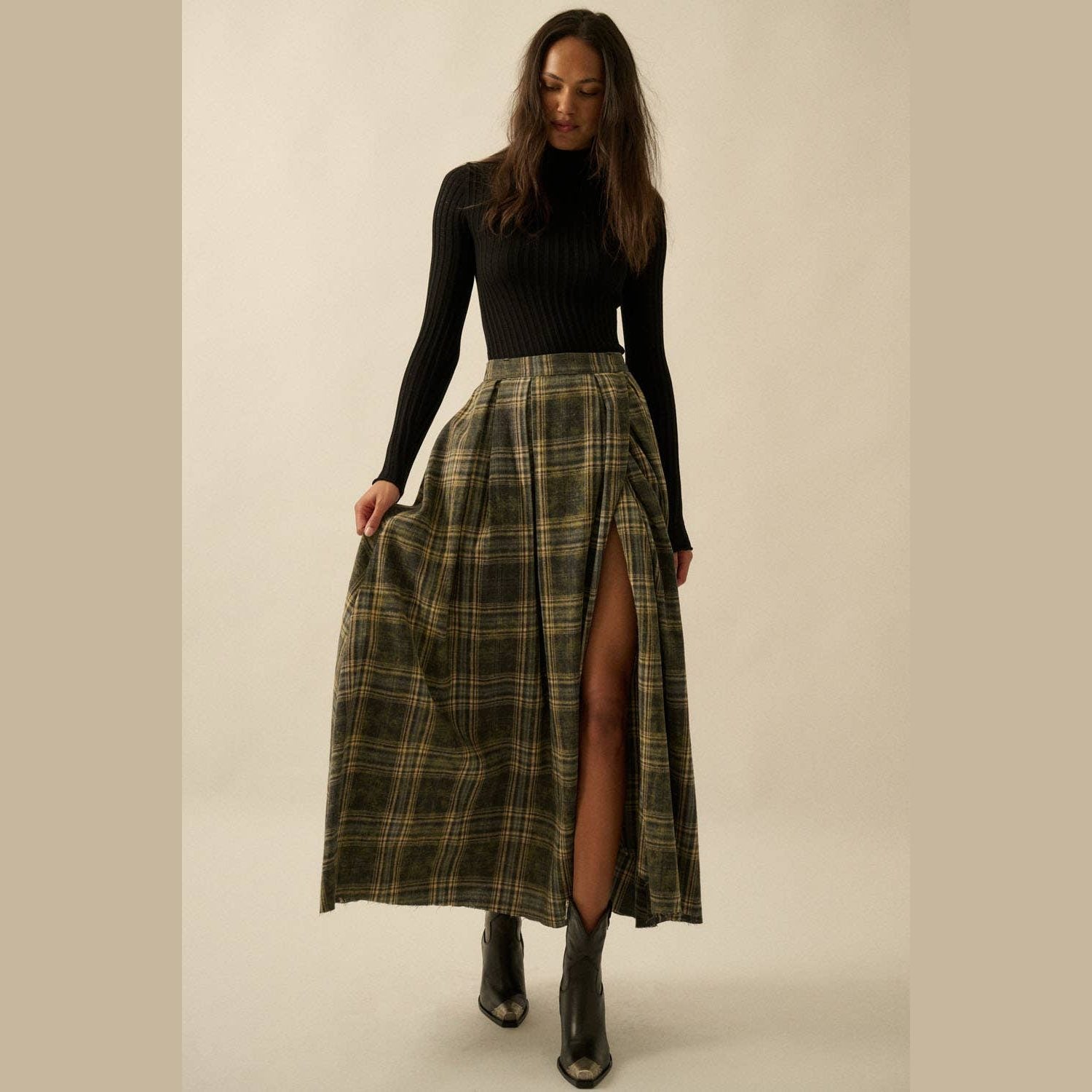 Plaid Flannel Pleated Wrapped Raw-Edge Maxi Skirt