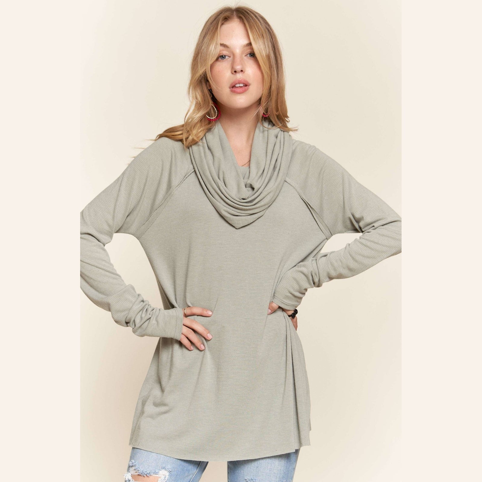 This tunic top is crafted from a blend of 63% polyester, 32% rayon, and 5% spandex. This fabric composition creates a soft, comfortable feel with a subtle texture. The generous cowl neck drapes elegantly, offering a cozy and chic silhouette. Long sleeves with thumbhole cuffs add a functional and stylish detail, perfect for cooler weather or a layered look. The relaxed, tunic-length cut ensures a flattering fit and easy wearability.
