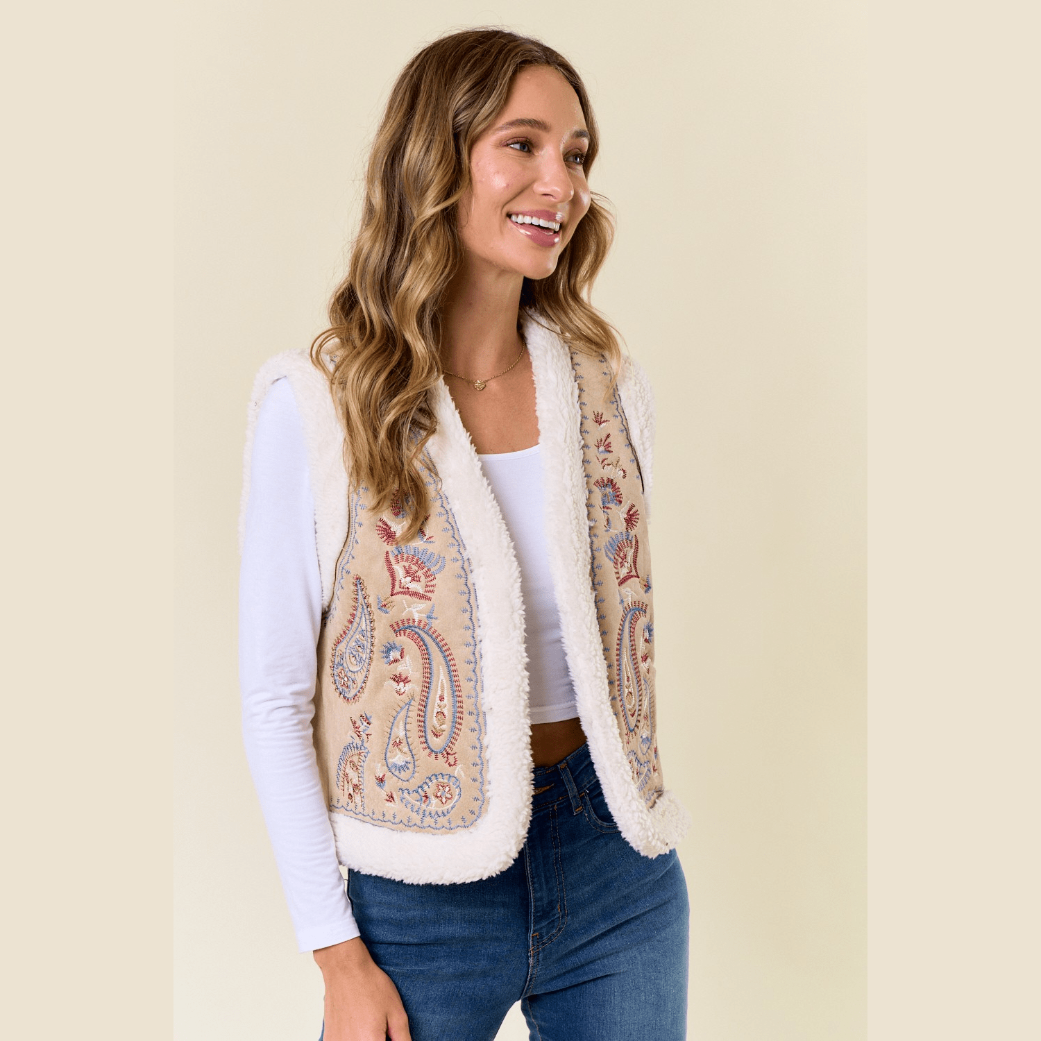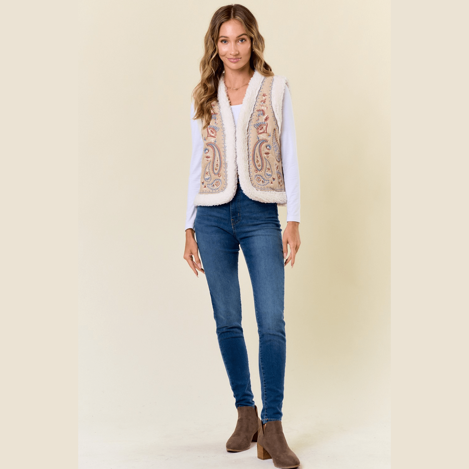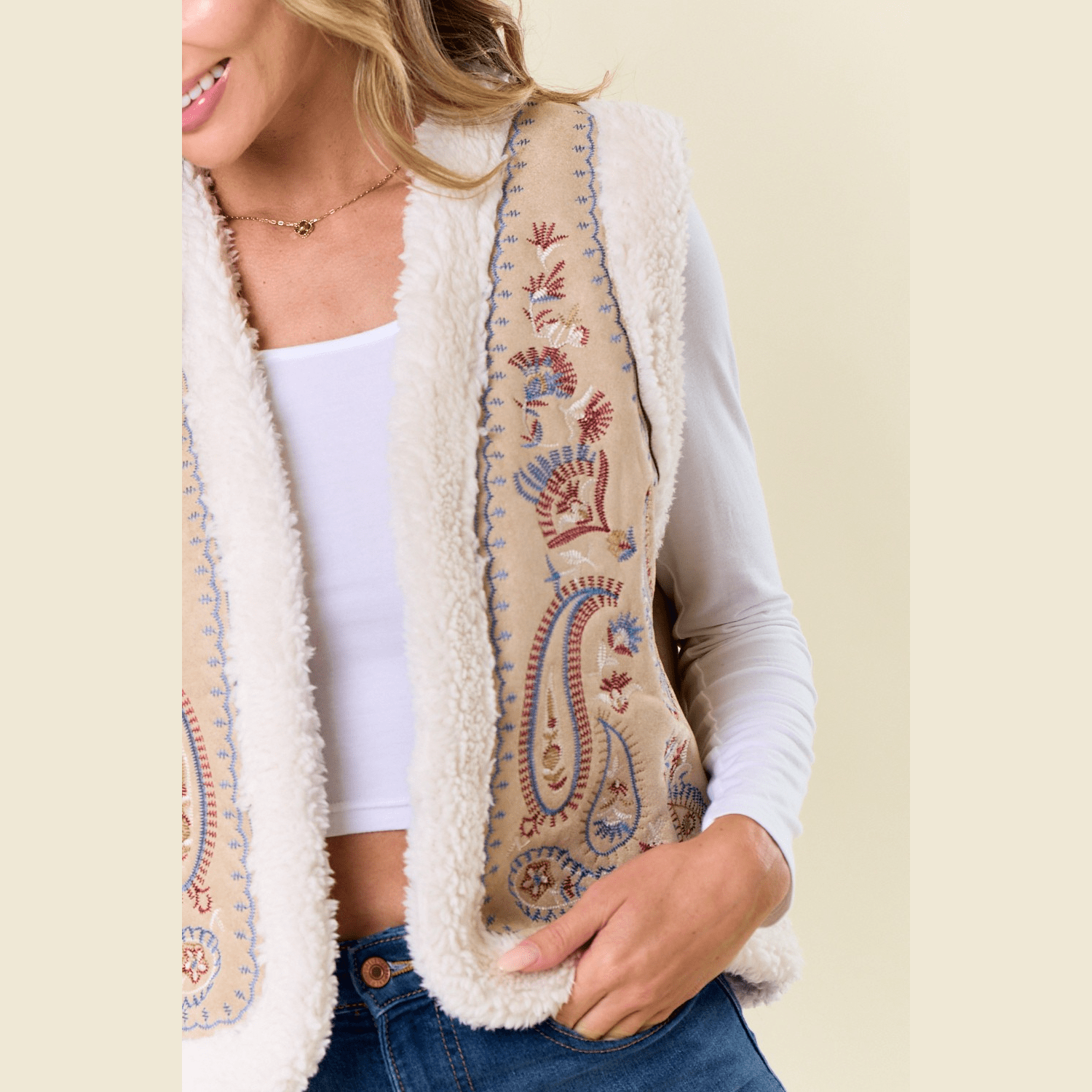 Faux Suede Vest with Sherpa Trim and Lining and Detailed Floral Embroidery