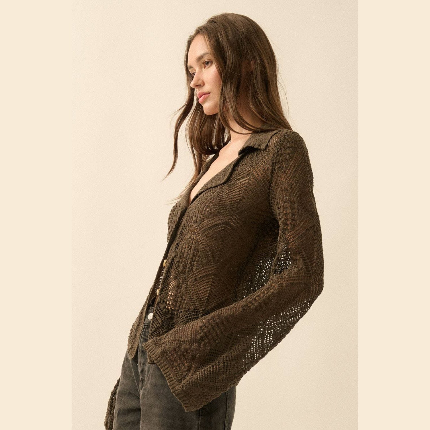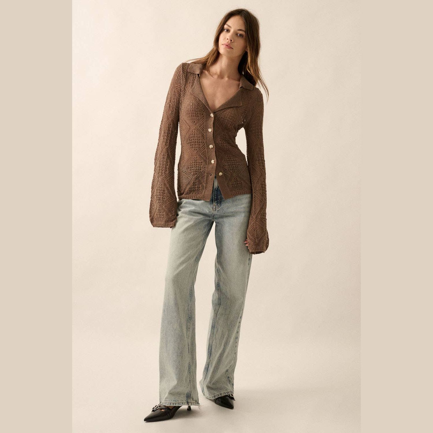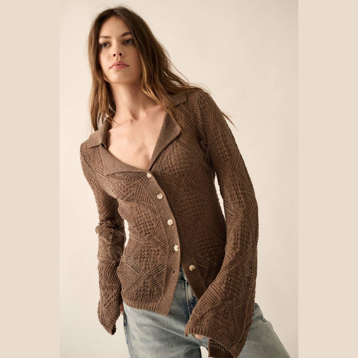 A solid open-knit cardigan with the following features: Geometric pointelle cable knit pattern. Notch lapel collar. Button-front closure with tortoise buttons. Long bell sleeves. Unlined. Ribbed knit collar, cuffs, and hem. Fitted silhouette.