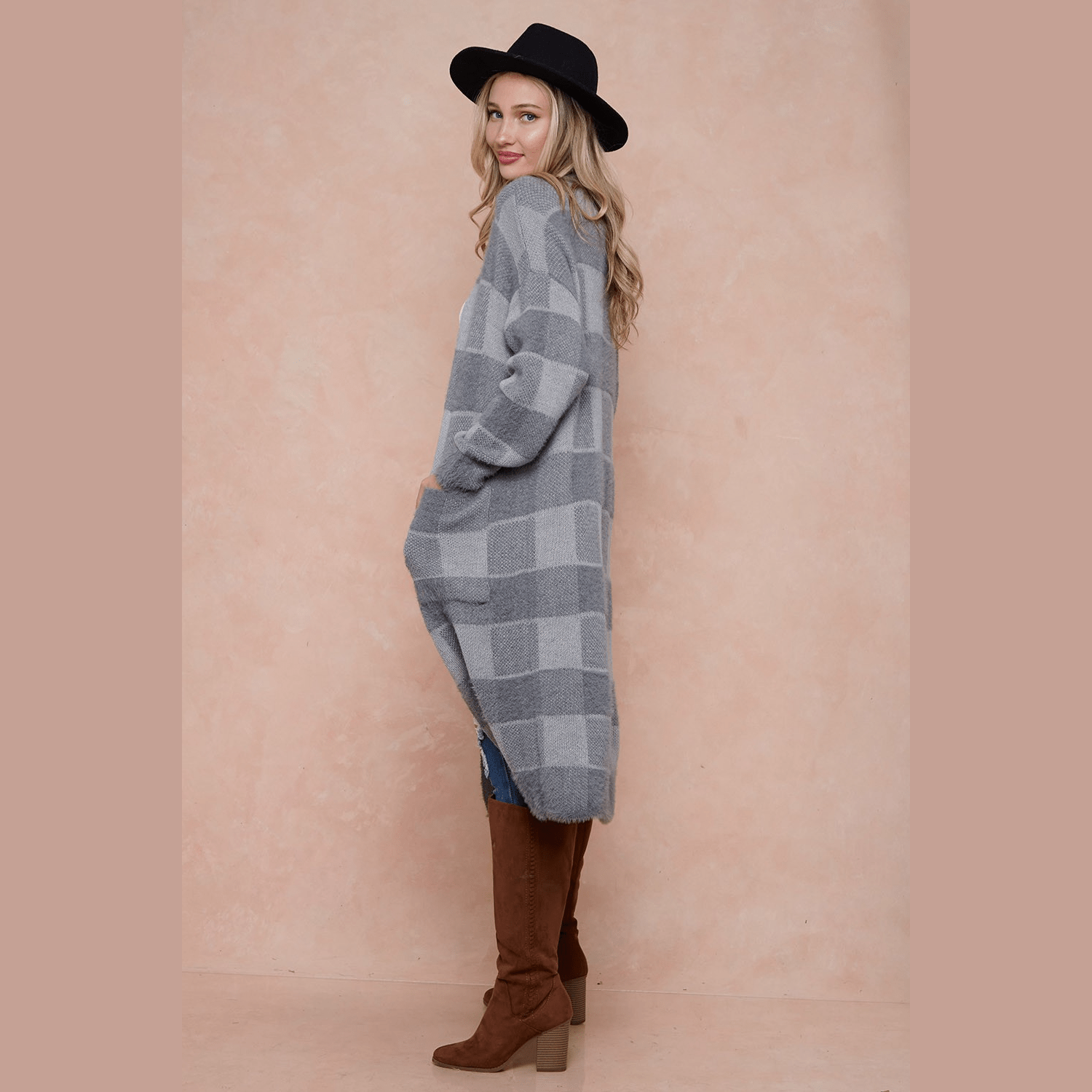 Sweater Duster Cardigan with Two Front Pocket Two Tone Checker Plaid Patterned Extremely Soft with a Fuzzy Texture